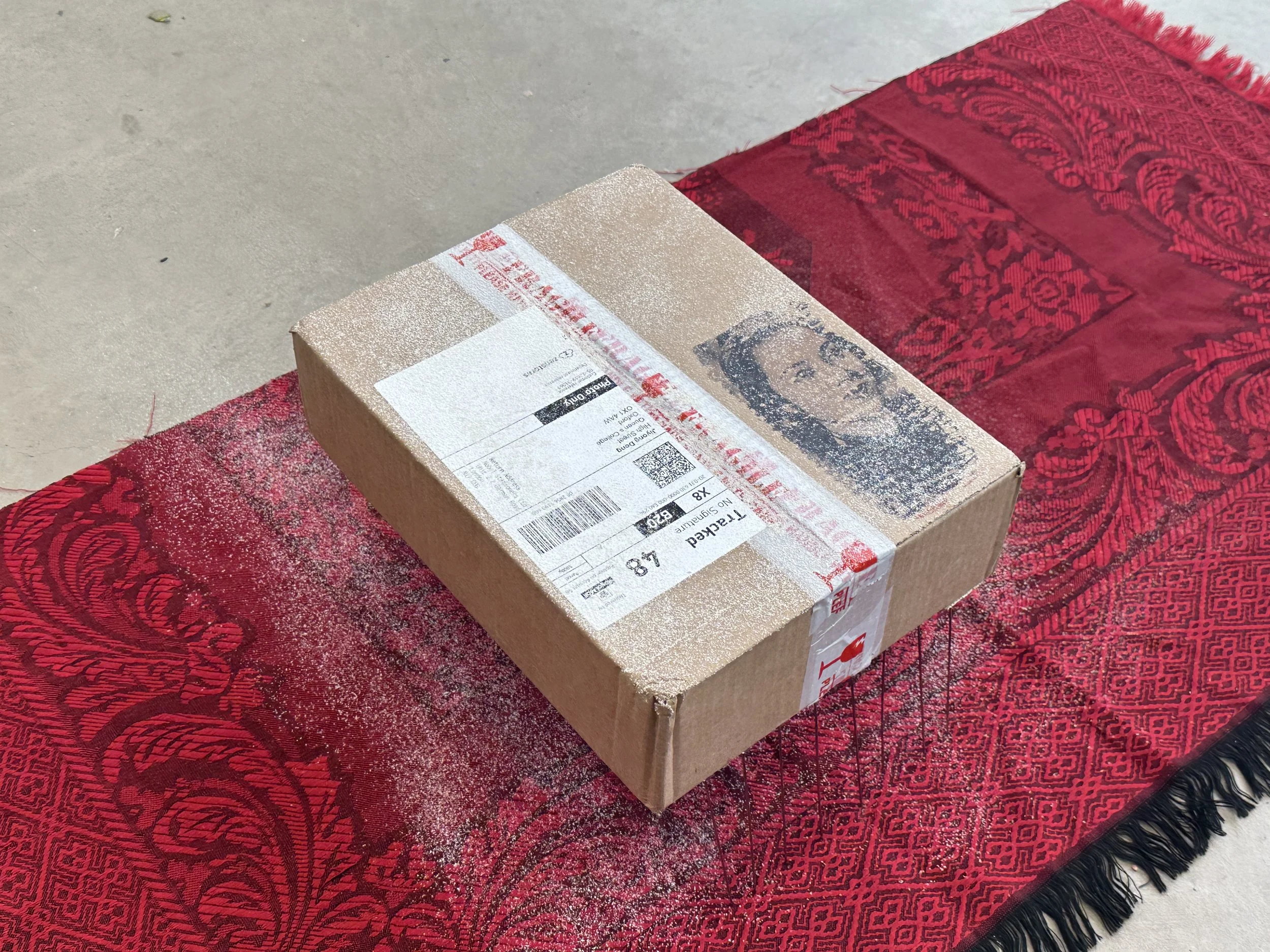 Parcel box, fluid medium, rug, chalk powder